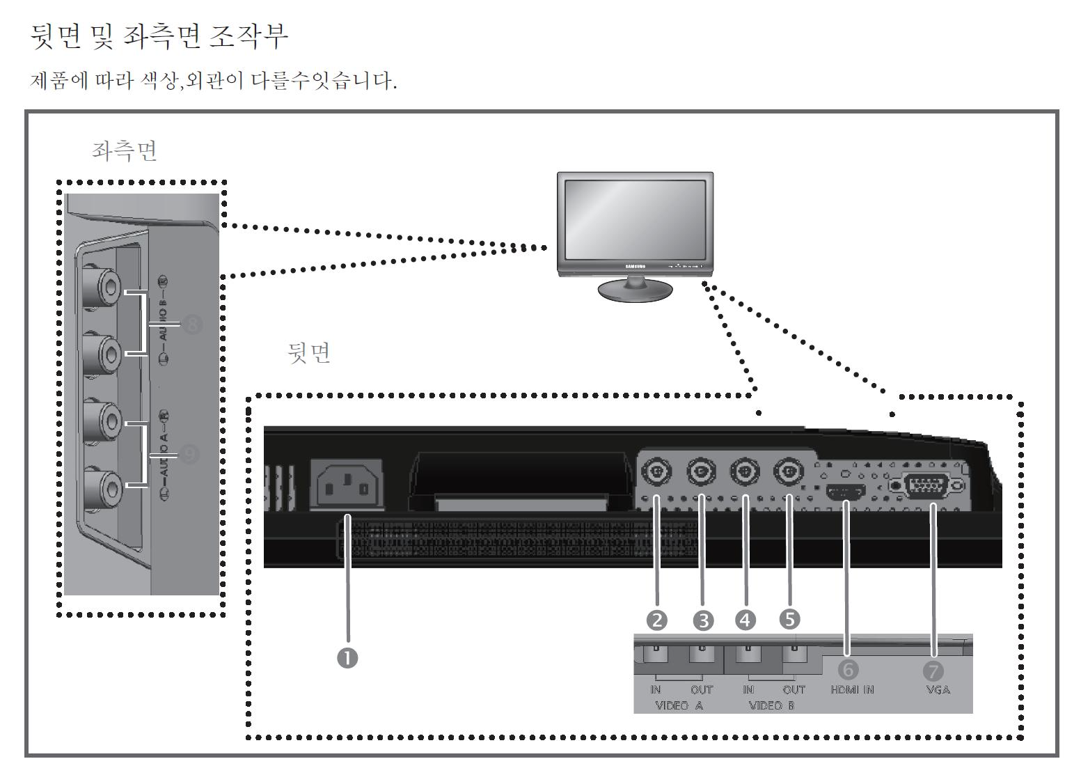고해상도를 지원하기 위해 사용되는 단자입니다. 주로 아날로그로 된 신호와 고속 데이터 전송에 사용되며 CCTV, 방송용으로 사용되다가 디지털 방식의 발달로 점차 생산이 줄어들고 있습니다. 주 입력 단자와 별도로 사용되기 때문에 컴퓨터를 켜지 않아도 모니터를 통해 외부 기기를 사용할 수 있습니다.
